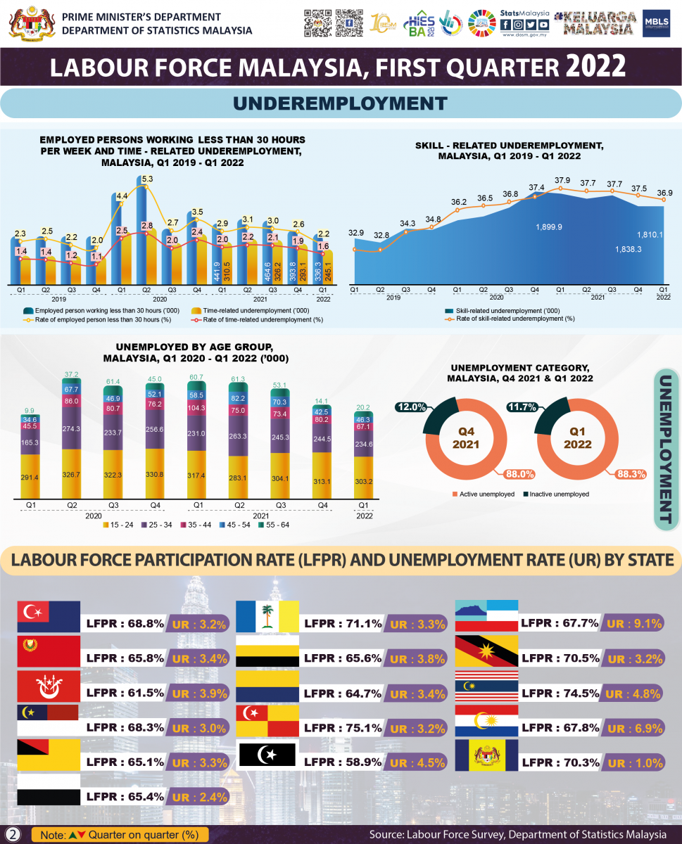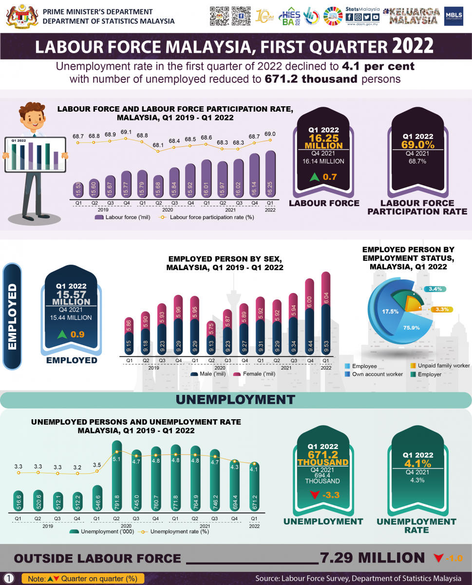The full publication of the Labour Force Survey Report, Malaysia, First Quarter 2022 can be downloaded through eStatistik Portal.