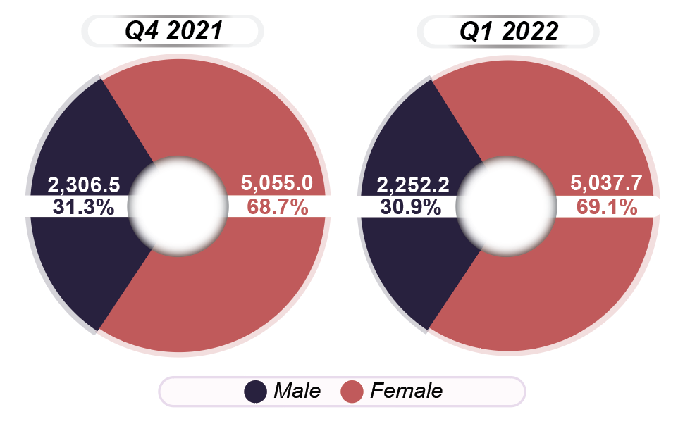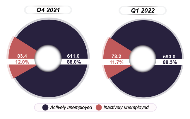 There were 593.0 thousand persons who were actively unemployed, encompassing for 88.3 per cent of unemployed persons, the increase of 0.3 percentage points from the previous quarter (Q4 2021: 88.0%; 611.0 thousand persons). Correspondingly, the percentage share of the inactively unemployed decreased by 0.3 percentage points to 11.7 per cent (Q4 2021: 12.0%; 83.4 thousand persons). [Chart 2]