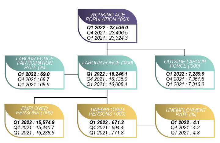 In the first quarter of 2022, labour force expanded by 0.7 per cent or 111.1 thousand persons to a total of 16.25 million persons (Q4 2021: 16.14 million persons). Similarly, as compared to the preceding quarter, the labour force participation rate (LFPR) escalated by 0.3 percentage points to 69.0 per cent. This was the highest LFPR recorded since the first quarter of 2020 but remained below its pre-pandemic ratio (Q1 2020: 68.8%).