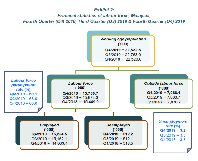 Labour force and employed persons in Malaysia recorded a growth of 2.1 per cent and 2.2 per cent as compared to the fourth quarter of 2018 to 15.77 million persons and 15.25 million persons respectively.