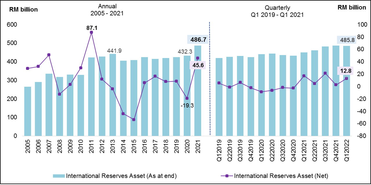 As at the end of the first quarter 2022, FDI position recorded RM812.1 billion while DIA position was RM551.7 billion. Malaysia’s International Investment Position (IIP) recorded a lower net asset position of RM47.3 billion as compared to RM84.9 billion in the previous quarter. The international reserves stood at RM485.8 billion compared to RM486.8 billion in the final quarter of preceding year.