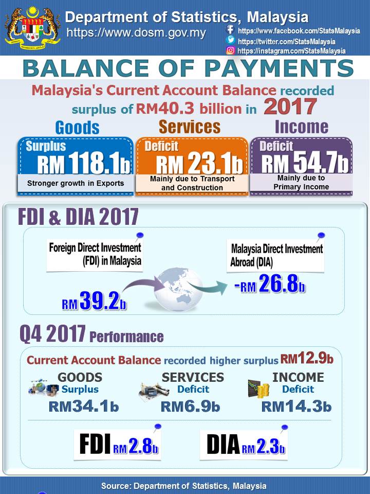 In 2017, the current account balance recorded a larger surplus of RM40.3 billion from RM29.0 billion in previous year. The strong performance in export of goods attributed to the higher surplus of RM118.1 billion. Meanwhile, as for direct investment flow, Foreign Direct Investment (FDI) in Malaysia recorded a net inflow of RM39.2 billion and Malaysia Direct Investment Abroad (DIA) registered a net outflow of RM26.8 billion.