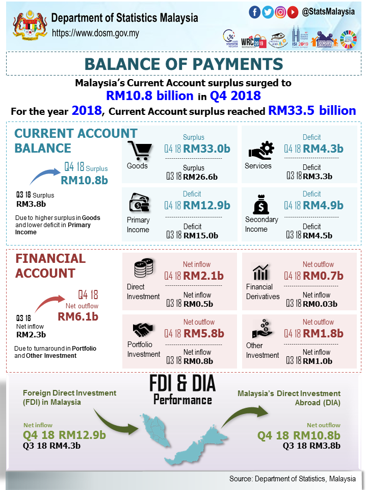 Malaysia’s current account surplus surged to RM10.8 billion in the final quarter of 2018 as compared RM3.8 billion in previous quarter. The favourable performance was spurred by larger surplus in goods account at RM33.0 billion from RM26.6 billion in the previous quarter. Meanwhile, financial account recorded a net outflow of RM6.1 billion (Q3 2018: net inflow RM2.3 billion). For the year 2018, the current account surplus reached RM33.5 billion contributed by higher surplus in goods account and lower deficit in services account.