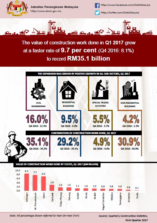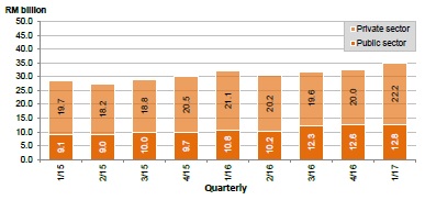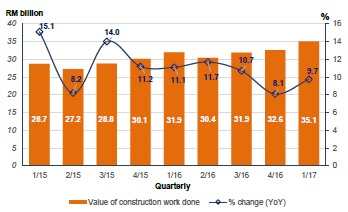 The value of construction work done in the first quarter 2017 grew at a faster rate of 9.7 per cent year-on-year to record RM35.1 billion (Q4 2016: RM32.6 billion). Meanwhile, on quarter-on-quarter basis, the value of construction work done expanded by 7.7 per cent as compared to the previous quarter (Chart 1).