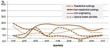 The expansion in value of construction work done in the first quarter 2017 was driven by positive growth in all sub-sectors: Civil engineering (16.0%), Residential buildings (9.5%), Non-Residential buildings (4.2%) and Special trades activities (5.5%) sub-sector as shown in Chart 2.