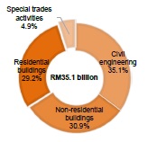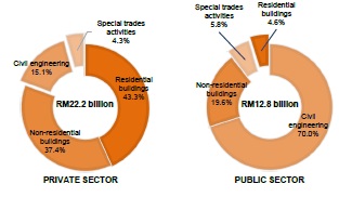 The private sector continued to propelled the construction activity with 63.5 per cent share (RM22.2 billion) as compared to the public sector with 36.5 per cent share (RM12.8 billion) as shown in Chart 6.