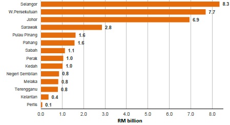 In the first quarter 2017, the highest value of construction work done were registered in Selangor with RM8.3 billion or 23.8 per cent share. The construction activities in Selangor was supported mainly by Residential and Non-residential buildings sub-sector. While, Wilayah Persekutuan ranked the second largest with RM7.7 billion (21.9% share) of the value of construction work done mainly supported by the Residential and Non-residential buildings sub-sector. The performance of other states is depicted in Chart 4 and Chart 5.