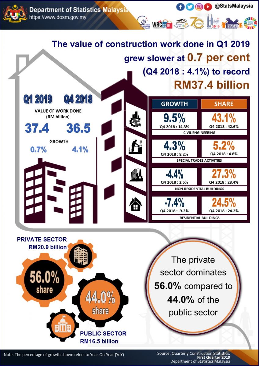 The value of construction work done in the first quarter 2019 recorded a slower growth of 0.7 per cent year-on-year to record RM37.4 billion (Q4 2018: RM36.5 billion).