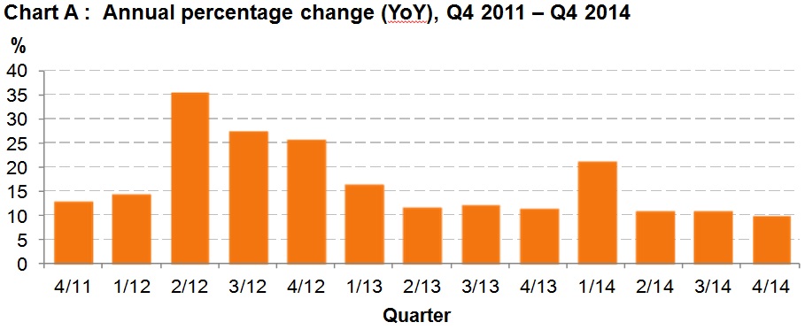 Chart A portrays the annual percentage change (YoY) for the fourth quarter 2011 to the fourth quarter of 2014. As shown in the chart, the construction sector recorded a positive growth since the fourth quarter of 2011.