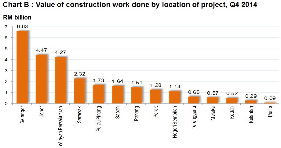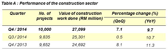 Performance of Construction Sector, Fourth Quarter 2014 The total value of construction work done in the fourth quarter 2014 recorded a growth of 9.7 per cent year-on-year to RM27.1 billion. The quarter-on-quarter percentage change showed a highly increase of 7.1 per cent as compared to the previous quarter as shown in Table A.