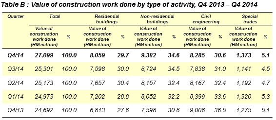 Construction activity by type In the fourth quarter of 2014, the highest percentage share was contributed by construction of non-residential buildings sub-sector which recorded 34.6 per cent. This was followed by civil engineering sub-sector (30.6%), residential buildings (29.7%), and special trades (5.1%) as shown in Table B.
