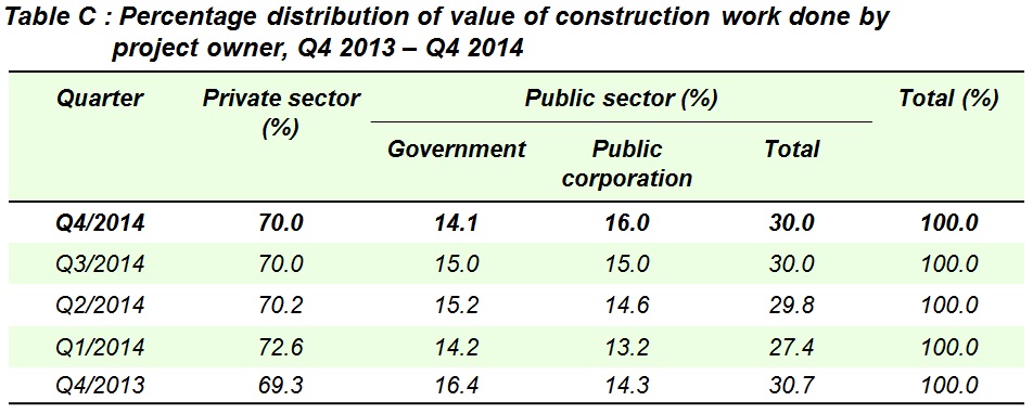 Construction by project owner In terms of construction activity by project owner, private sector continued to dominate with share of 70.0 per cent in the third quarter of 2014 as shown in Table C. Chart D shows the trend of construction activity by project owner.