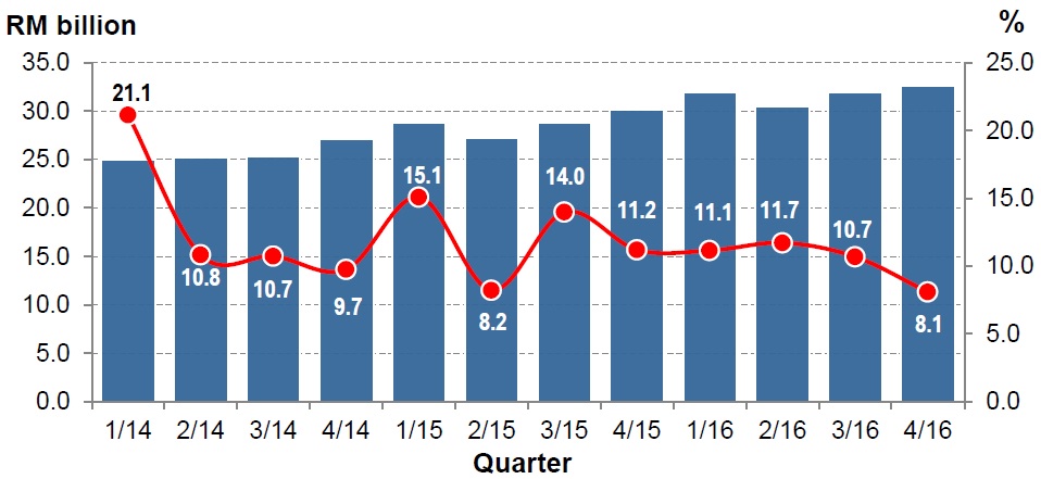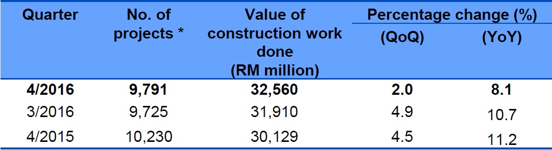 The value of construction work done grew by 8.1 per cent year-on-year basis to record RM32.6 billion in the fourth quarter 2016. Growth was driven mainly by the Civil engineering sub-sector. While, on quarter-on-quarter basis, the value of construction work done increased by 2.0 per cent as compared to the previous quarter. The performance of the construction sector is depicted in Table A.