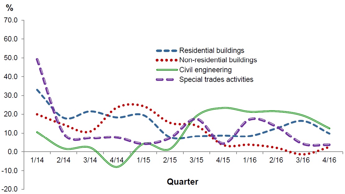 The highest growth was contributed by the Civil engineering sub-sector with 12.5 per cent, followed by Residential buildings (9.8%), Special trades activities (3.7%) and Non-residential buildings sub-sector (2.5%) in the fourth quarter 2016 (Chart 2).