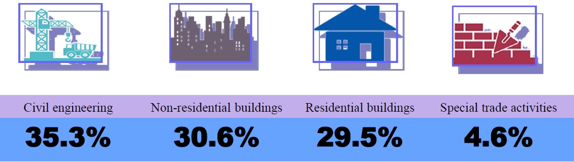 The Civil engineering sub-sector contributed 35.3 per cent to the total value of construction work done, followed by Non-residential buildings (30.6%), Residential buildings (29.5%) and Special trades activities (4.6%) as shown in Chart 3.