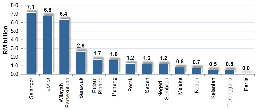 Selangor recorded the highest value of construction work done of RM7.1 billion or 21.9 per cent share among the states. This was followed by Johor, RM6.8 billion (20.8%); Wilayah Persekutuan, RM6.4 billion (19.5%); Sarawak, RM2.6 billion (8.1%) and Pulau Pinang, RM1.7 billion (5.3%). The contribution of these states accounted for 75.6 per cent of the total value of construction work done as shown in Chart 4.