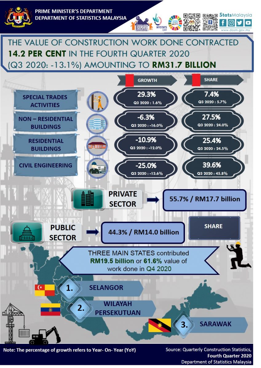 The value of construction work done in the fourth quarter 2020 contracted by 14.2 per cent (Q3 2020: -13.1%) year-on-year basis, amounting to RM31.7 billion (Q3 2020: RM31.4 billion).