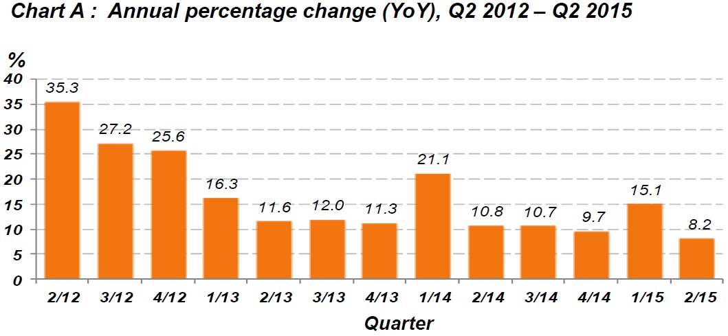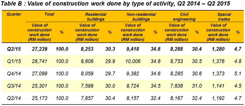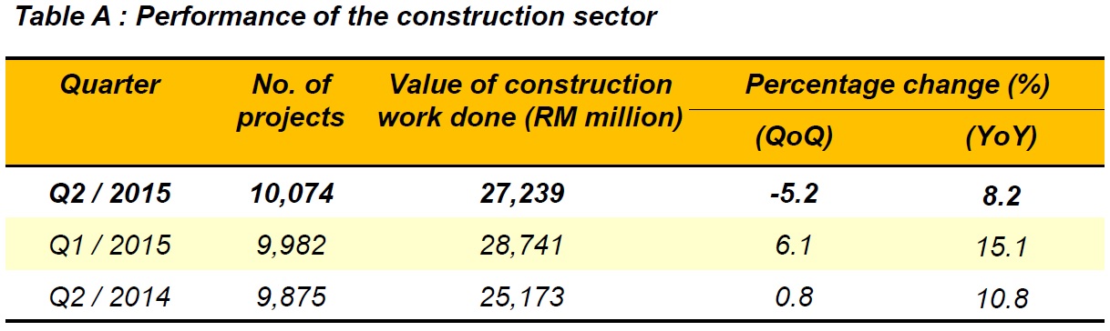 The total value of construction work done in the second quarter 2015 recorded a growth of 8.2 per cent year-on-year to RM27.2 billion. The quarter-on-quarter percentage change showed a decrease of 5.2 per cent as compared to the previous quarter as shown in Table A.