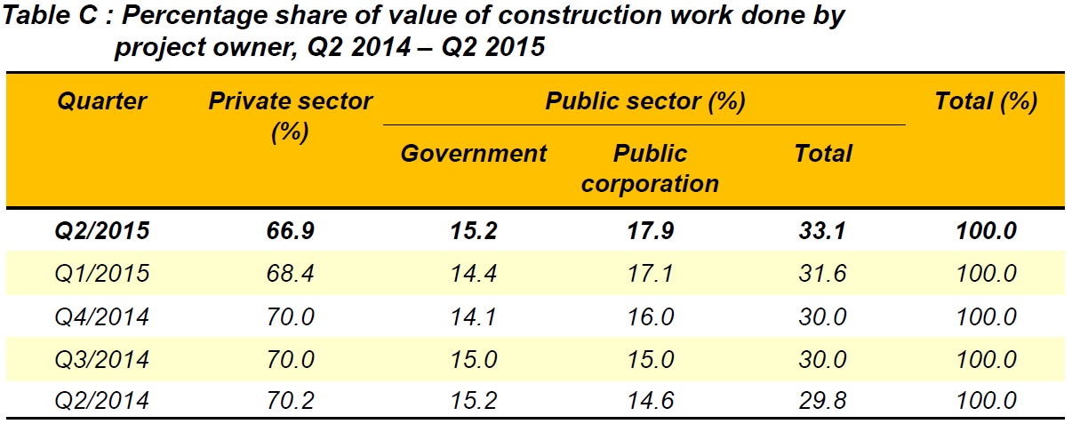 In terms of construction activity by project owner, private sector continued to dominatewith share of 66.9 per cent in the second quarter of 2015 as shown in Table C.