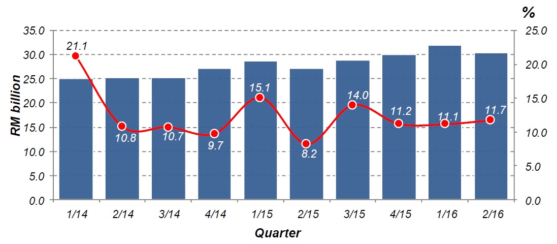 The value of construction work done grew by 11.7 per cent year-on-year basis to record RM30.4 billion in the second quarter 2016. Growth was driven mainly by the civil engineering sub-sector. On a quarter-on-quarter basis, the value of construction work done contracted by 4.7 per cent as compared to the preceding quarter. The decline in growth was due to a slowdown in non-residential buildings sub-sector. The performance of the construction sector is depicted in Table A.