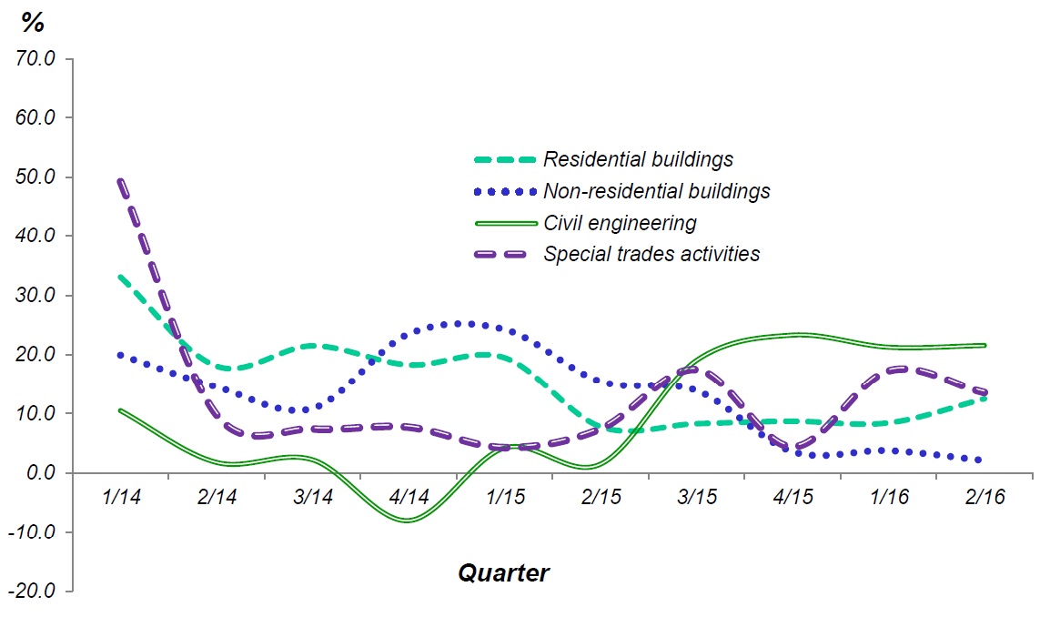 The highest growth was contributed by the civil engineering sub-sector with 21.6 per cent, followed by the special trades activities (13.5%), residential buildings (12.5%) and non-residential buildings (2.1%) as shown in Chart 2.