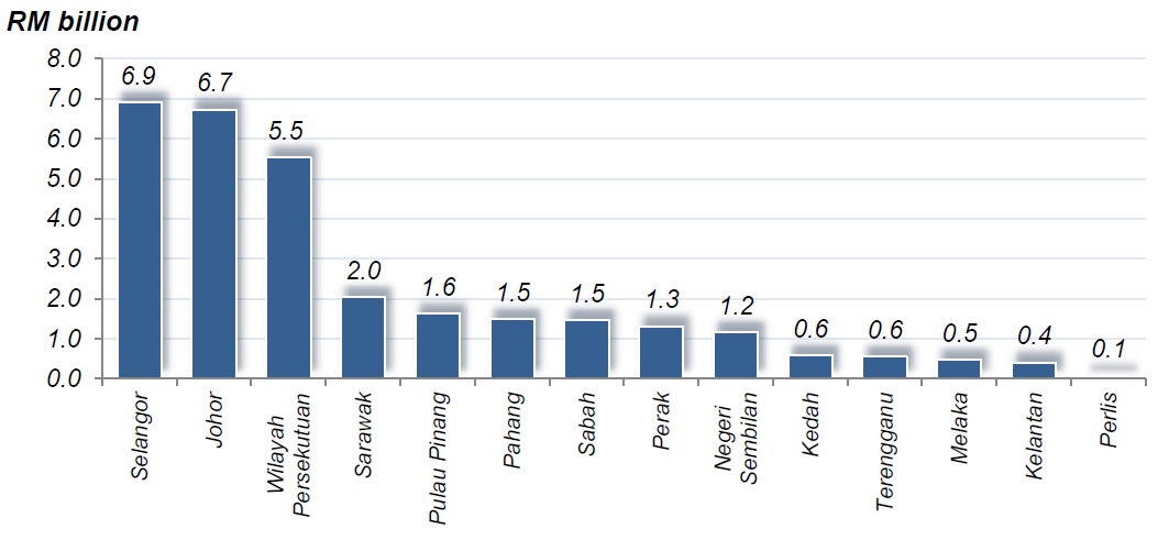 Selangor recorded the highest value of construction work done of RM6.9 billion or 22.7 per cent share among the states. This was followed by Johor, RM6.7 billion (22.1%); Wilayah Persekutuan, RM5.5 billion (18.2%); Sarawak, RM2.0 billion (6.7%) and Pulau Pinang, RM1.6 billion (5.3%). The contribution of these states accounted for 75.0 per cent of the total value of construction work done as shown in Chart 4.