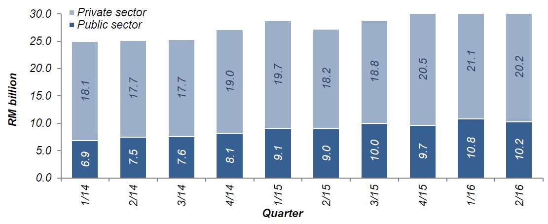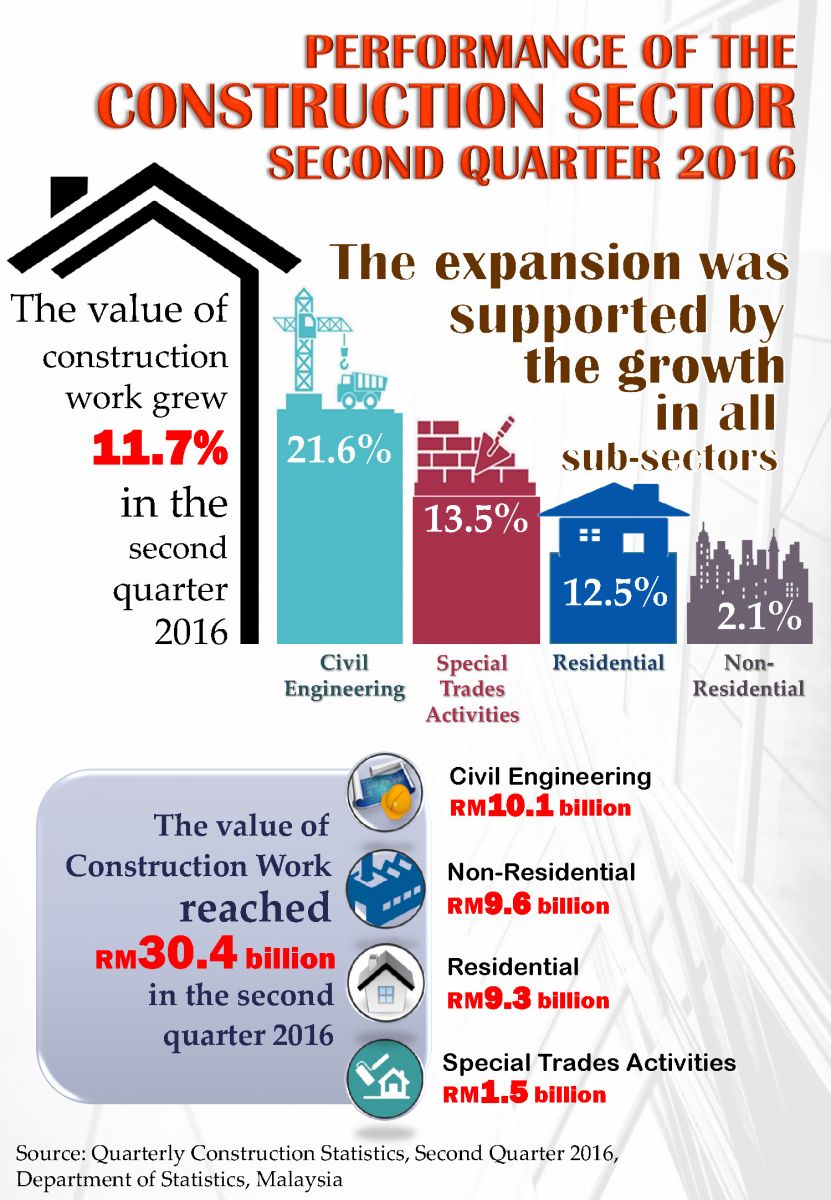 The value of construction work done continued to be driven by the private sector. The private and the public sectors recorded RM20.2 billion and RM10.2 billion respectively in the second quarter of 2016 as shown in Chart 5.