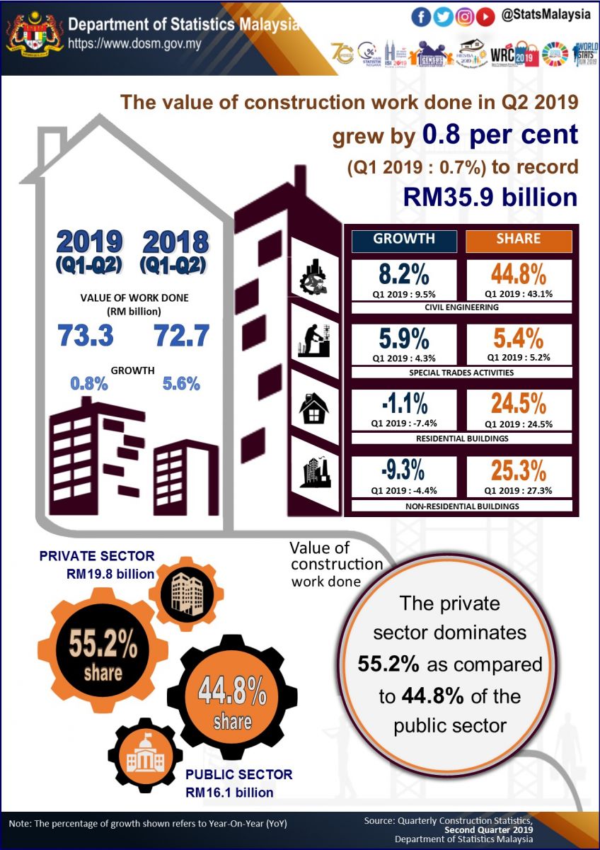 The value of construction work done in the second quarter 2019 recorded a growth of 0.8 per cent year-on-year, amounting to RM35.9 billion (Q1 2019: RM37.4 billion).
