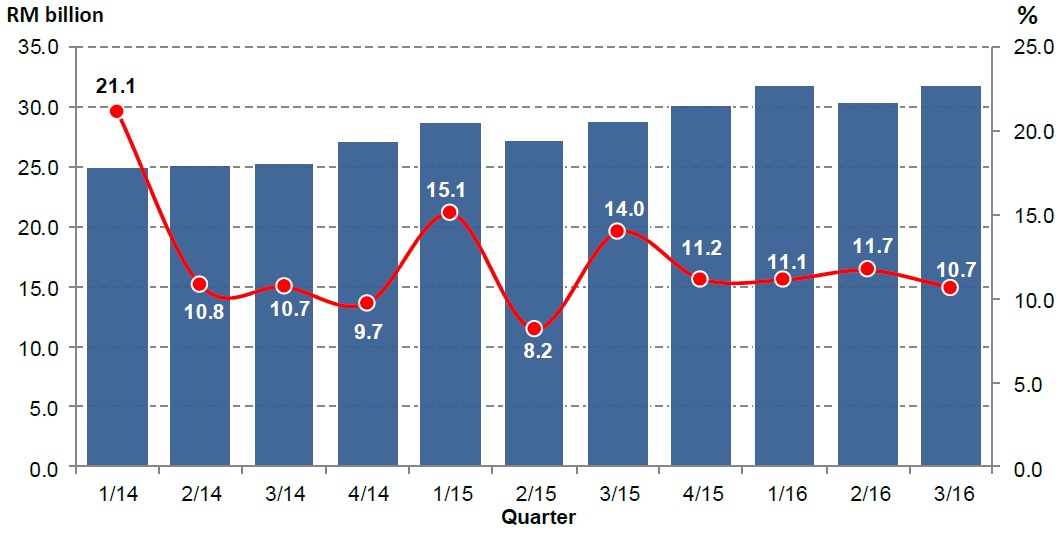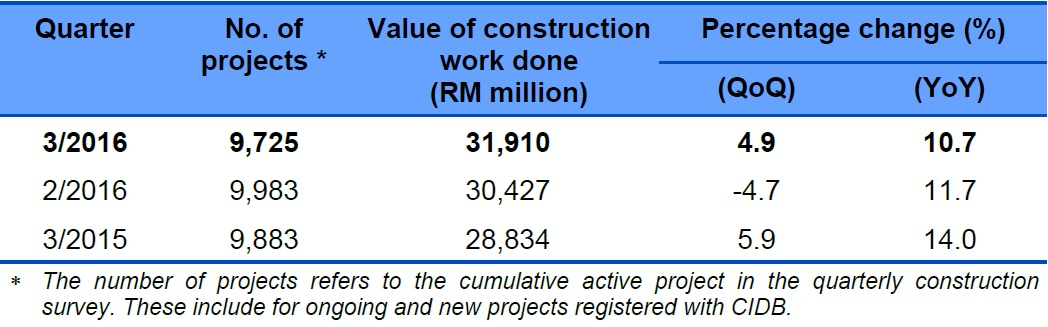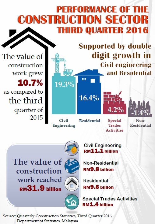 The value of construction work done grew by 10.7 per cent year-on-year basis to record RM31.9 billion in the third quarter 2016. Growth was driven mainly by the Civil engineering sub-sector. While, on quarter-on-quarter basis, the value of construction work done increased by 4.9 per cent as compared to the previous quarter. The performance of the construction sector is depicted in Table A.