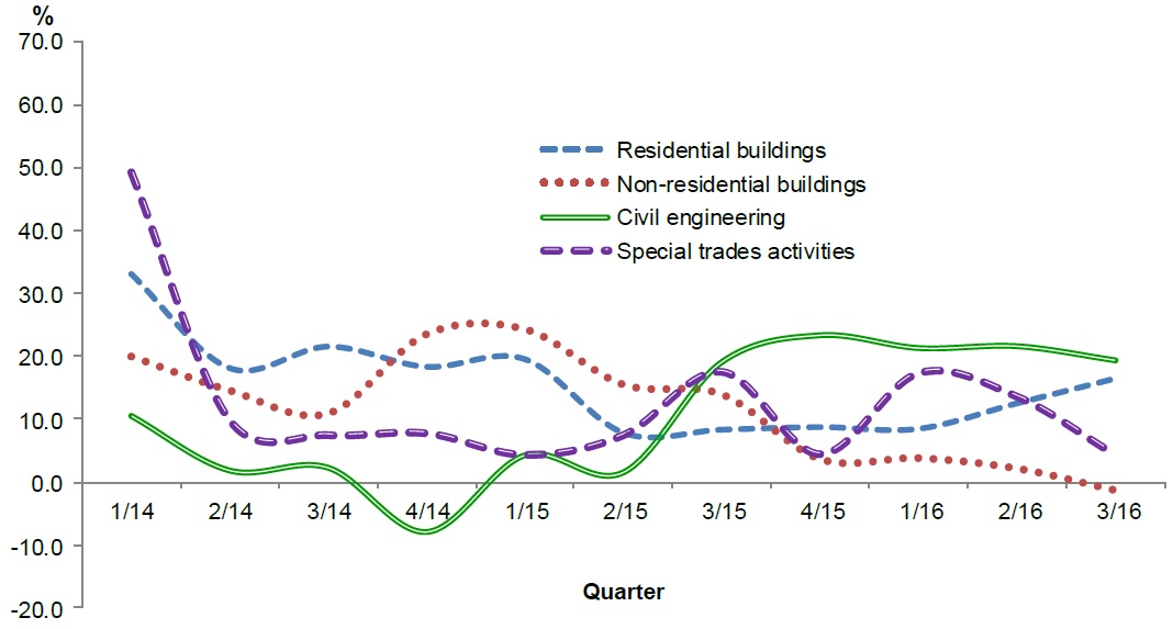 The highest growth was contributed by the Civil engineering sub-sector with 19.3 per cent, followed by Residential buildings (16.4%) and Special trades activities (4.2%). Meanwhile, the Non-residential buildings sub-sector registered a negative growth of 1.4 per cent in the third quarter 2016. (Chart 2).