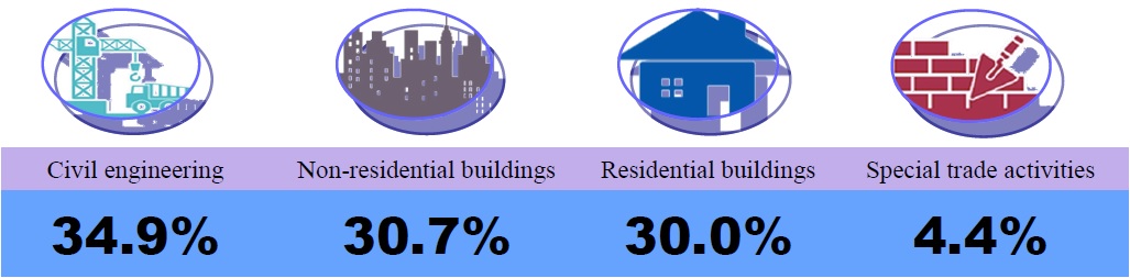 The Civil engineering sub-sector contributed 34.9 per cent to the total value of construction work done, followed by Non-residential buildings (30.7%), Residential buildings (30.0%) and Special trades activities (4.4%) as shown in Chart 3.