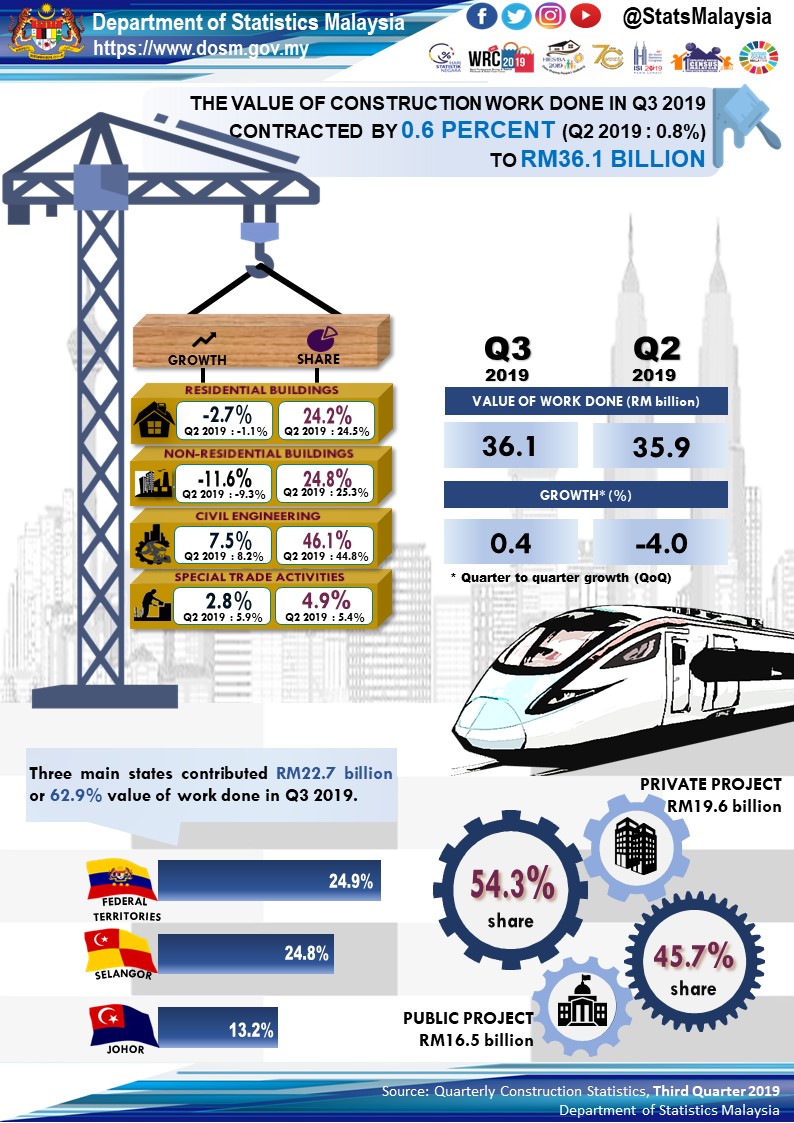 The value of construction work done in the third quarter 2019 contracted 0.6 per cent year-on-year basis, amounting to RM36.1 billion (Q2 2019: RM35.9 billion).