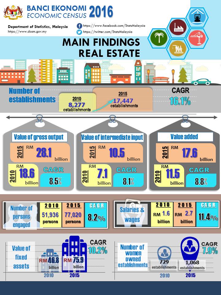 Value of gross output generated for this services amounted to RM28.1 billion. Within the period of 2010 and 2015, there was an increase of RM9.4 billion registering a CAGR of 8.5 per cent. In line with the value of gross output, value added for real estate services recorded an increased of 8.8 per cent per annum with a value of RM17.6 billion.