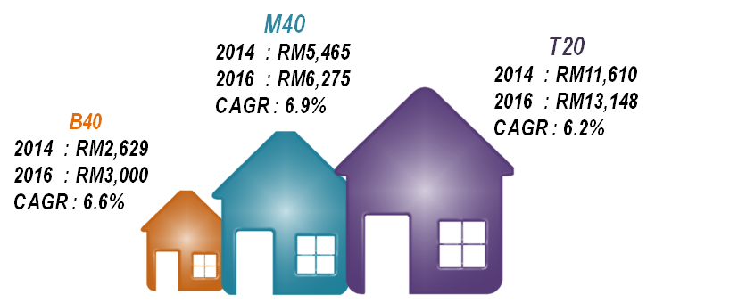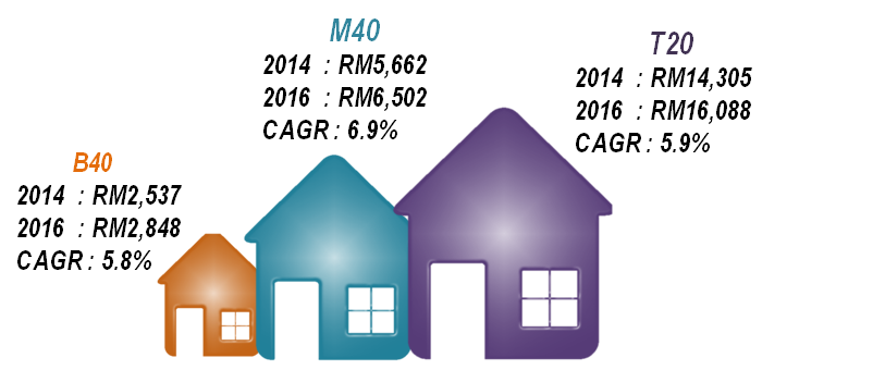 All household groups recorded an increase in the mean monthly household income during the period of 2014 to 2016. The M40 group recorded the highest annual growth rate of 6.9 per cent from RM5,662 in 2014 to RM6,502 in 2016.