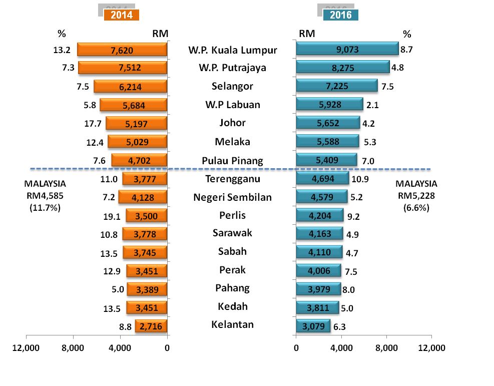 W.P. Kuala Lumpur recorded the highest mean monthly household income (RM11,692) in 2016 followed by W.P. Putrajaya (RM11,555), Selangor (RM9,463) and, W.P. Labuan (RM8,174). Other states recorded mean monthly household income below the national level (RM6,958).