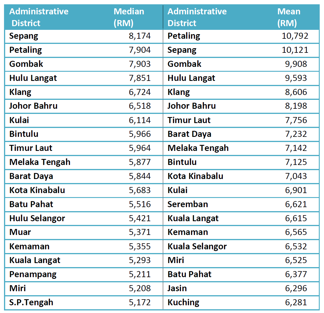 The districts of Sepang (RM8,174), Petaling (RM7,904), Gombak (RM7,903) , Hulu Langat (RM7,851), Klang (RM6,724) and Johor Bahru (RM6,518) recorded the highest median household income of the 140 administrative districts in the survey in 2016. Similar trend was shown in the mean household income. The ranks of the six highest groups remained unchanged as compared to 2014. Seventeen districts recorded higher median household income than the national level of RM5,228 and 11 districts registered mean household income above the national level of RM6,958.