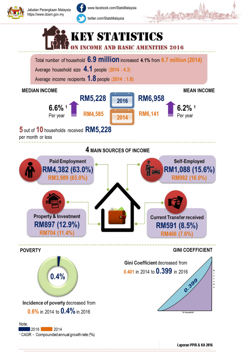 The Gini Coefficient declined to 0.399 from 0.401 (2014). This indicating the improvement in the Malaysian household income distribution. Income distribution for urban strata declined to 0.389 from 0.391 (2014) , whilst household income distribution for rural strata rose to 0.364 from 0.355 (2014).