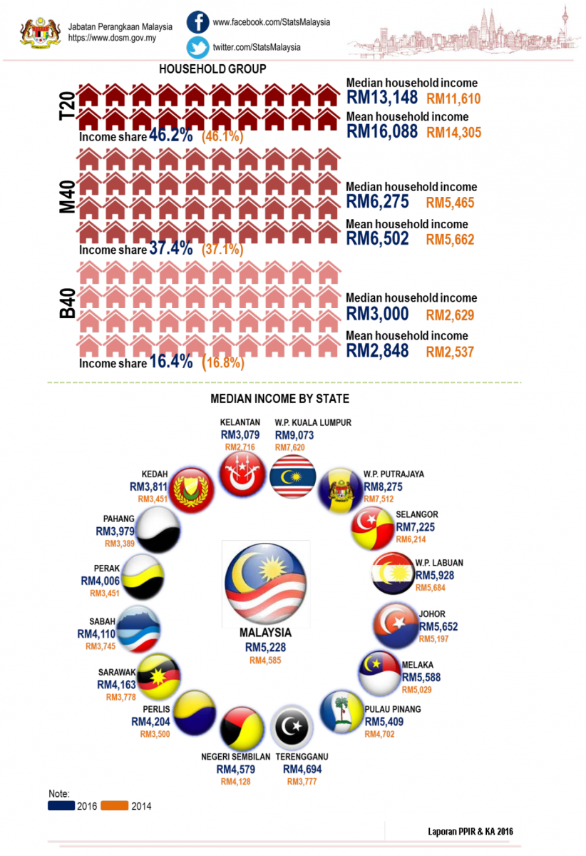 The median income of the bottom 40% (B40), middle 40% (M40) and top 20% (T20) rose in 2016 as compared to 2014. The household group M40 recorded the highest growth of 6.9 per cent per annum followed by the household group B40 (6.6%) and T20 (6.2%).