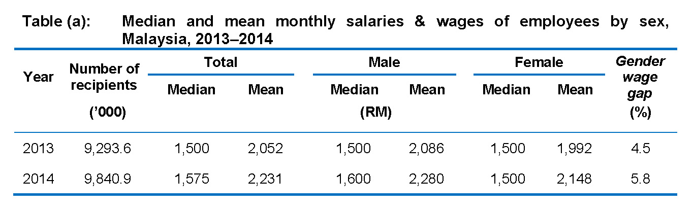 In 2014, the median monthly salaries & wages of male employees was RM1,600 compared to female employees at RM1,500. In terms of the mean, male employees received monthly salaries & wages of RM2,280, slightly higher than female employees with RM2,148, with the gender wage gap of 5.8 per cent.