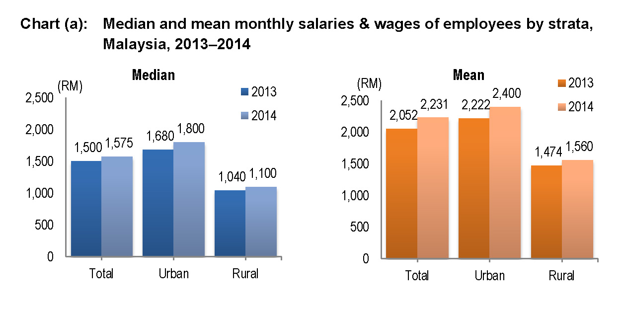The median monthly salaries & wages received by paid employees increased to RM1,575 in 2014 compared with RM1,500 in 2013, recording the annual growth rate of 4.9 per cent. Meanwhile, the mean monthly salaries & wages increased by 8.4 per cent during the same period that is from RM2,052 to RM2,231.