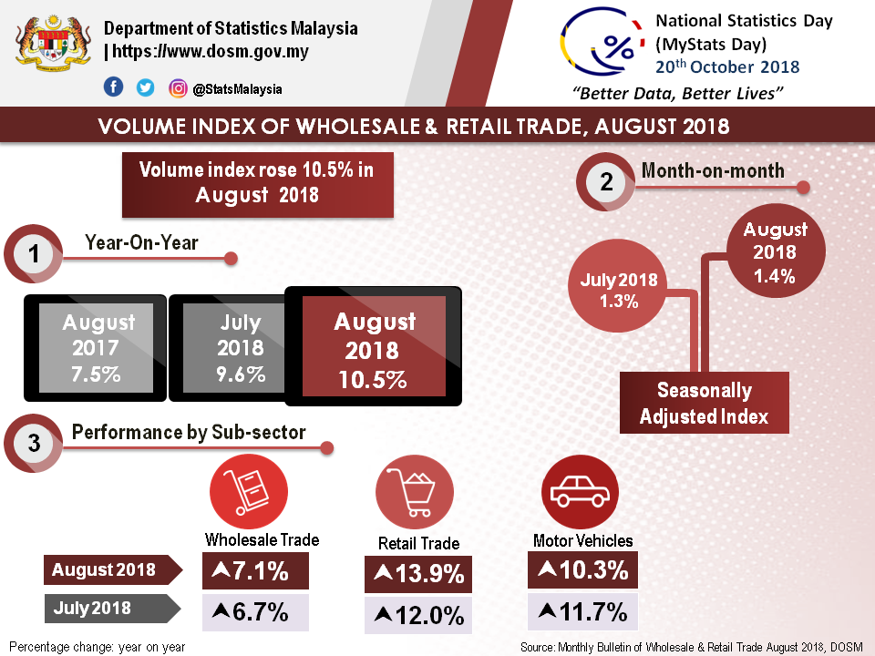 In the month of August 2018, sales of Wholesale & Retail Trade sustained double-digit growth momentum to rise 10.7 per cent to RM107.9 billion. The expansion was attributed by Retail Trade (14.8%) and Motor Vehicles (10.6%).