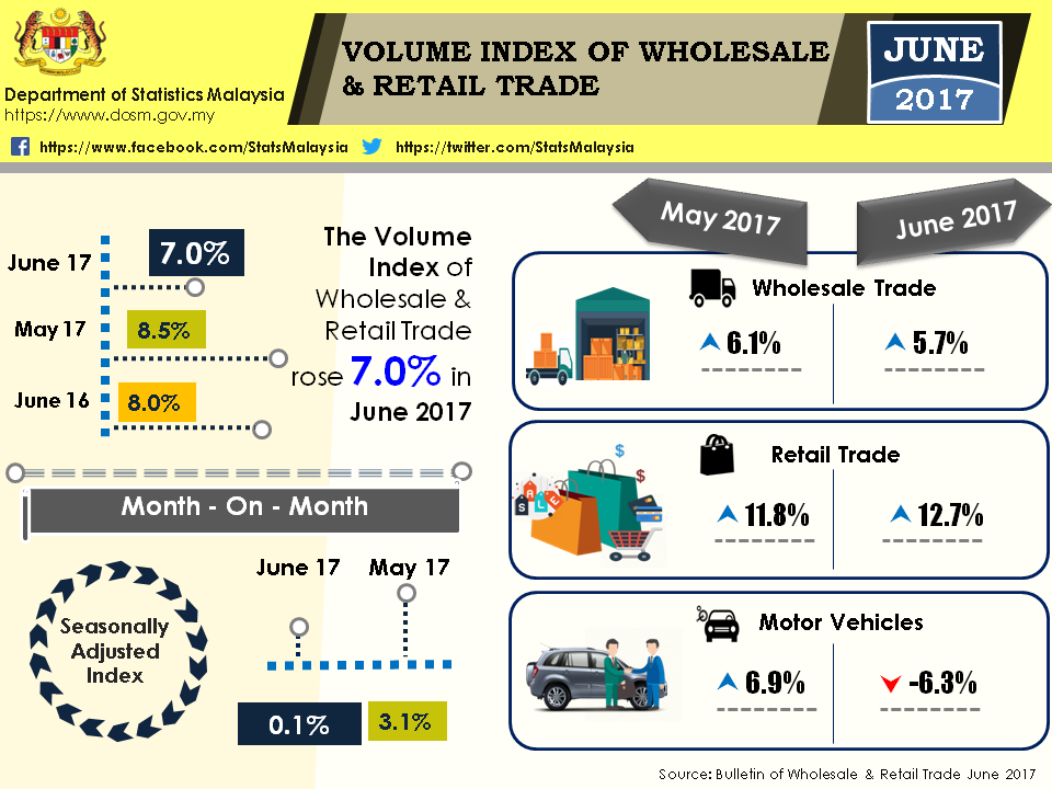 Sales value of Wholesale & Retail Trade stood at RM96.9 billion in June 2017, registering 8.6 per cent growth as compared to the corresponding period in 2016. The sales value consists of Wholesale Trade (RM46.9 billion), Retail Trade (RM38.1 billion) and Motor Vehicles (RM11.8 billion) businesses. The positive growth was contributed by Retail Trade (13.9%).