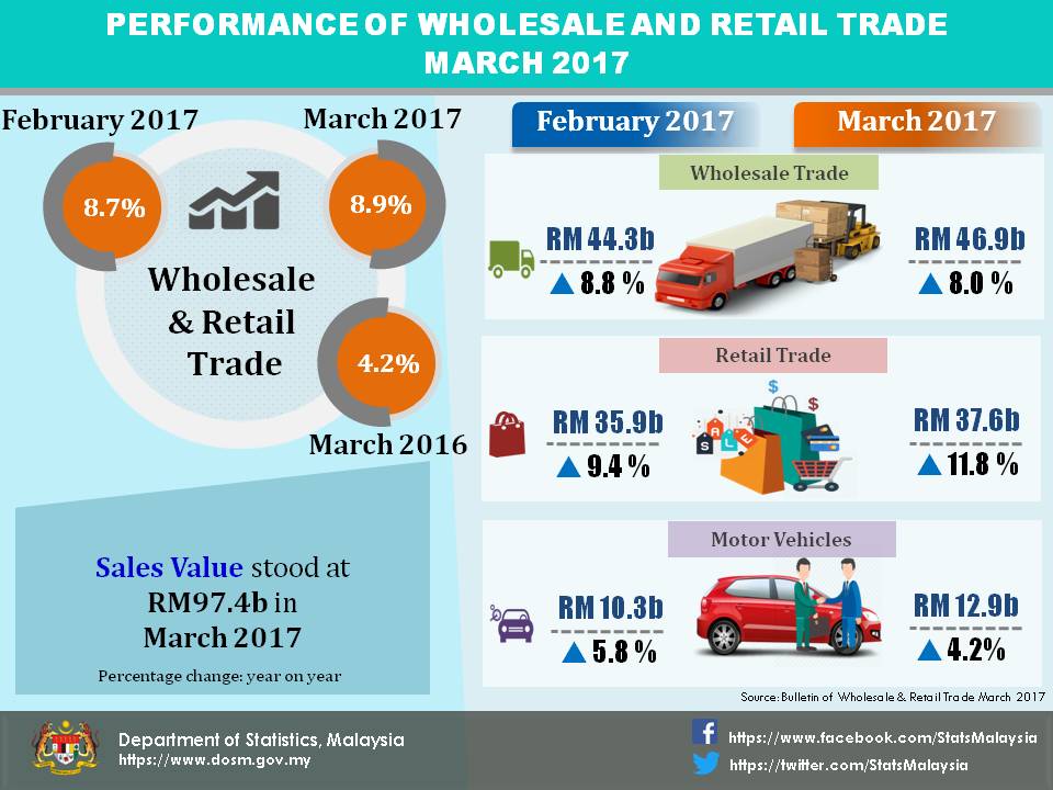 Sales value of Wholesale & Retail Trade stood at RM97.4 billion in March 2017, registering 8.9 per cent growth as compared to the corresponding period in 2016. The sales value consists of Wholesale Trade ( RM46.9 billion), Retail Trade (RM37.6 billion) and Motor Vehicles (RM12.9 billion) businesses. The positive growth was contributed by Retail Trade (11.8%).