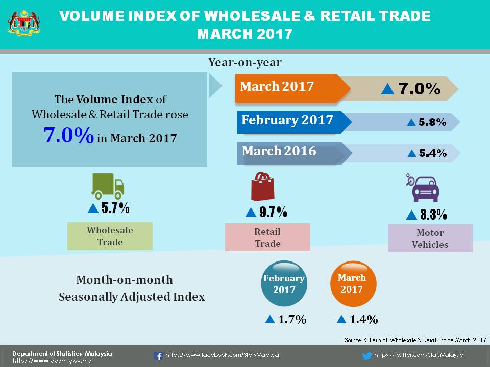 The volume index of Wholesale & Retail Trade rose 7.0 per cent to 159.6 points in March 2017 as compared to March 2016. The growth was supported by the increase in Retail Trade ( 9.7%). The seasonally adjusted volume index of Wholesale & Retail Trade increased 1.4 per cent as compared to the preceding month.