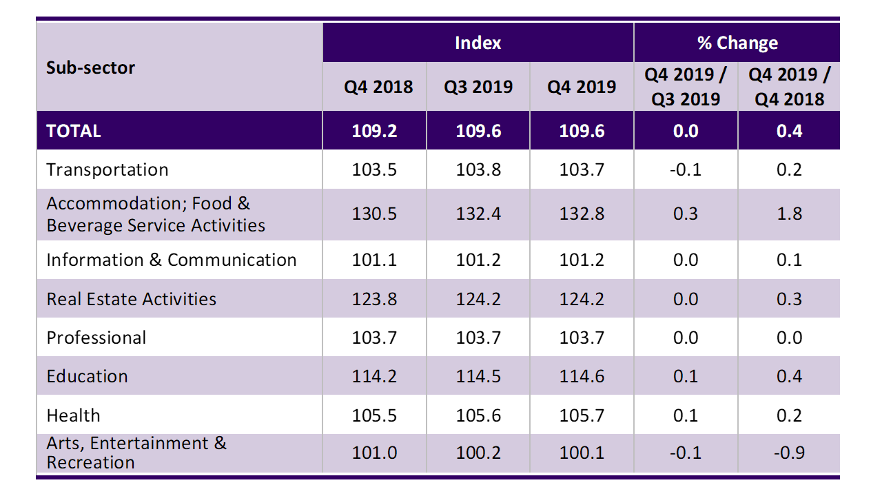 For quarterly comparisons, the index for the fourth quarter 2019 was unchanged. However, the index increased for Accommodation; Food & Beverage Service Activities (0.3%), Health (0.1%) and Education (0.1%). On the other hand, the index for Arts, Entertainment & Recreation and Transportation, dropped 0.1 per cent respectively. Meanwhile, Real Estate Activities, Information & Communication and Professional indices was unchanged.