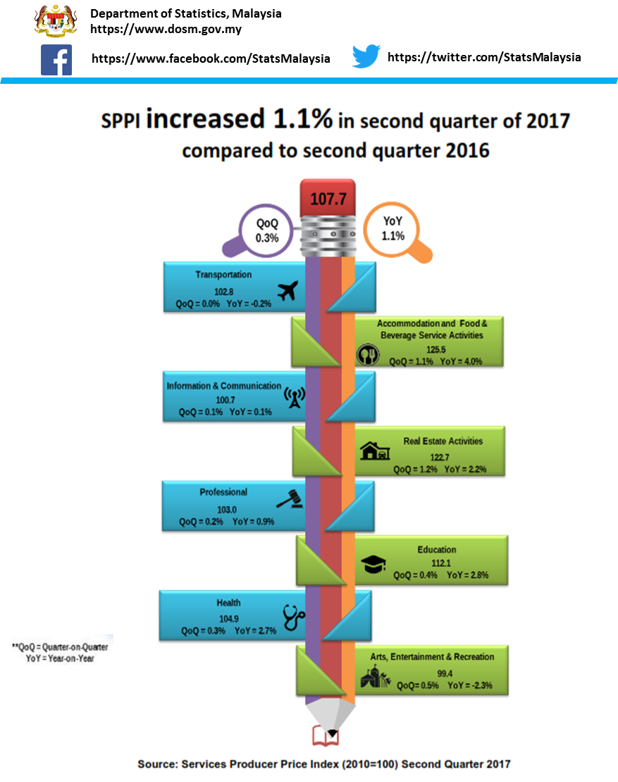 SPPI for the second quarter of 2017 registered an increase of 0.3 per cent compared to the previous quarter. The sub-sectors that recorded positive growth are Real Estate Activities (1.2%), Accommodation and Food & Beverage Service Activities (1.1%), Arts, Entertainment & Recreation (0.5%), Education (0.4%), Health (0.3%), Professional (0.2%) and Information & Communication (0.1%).