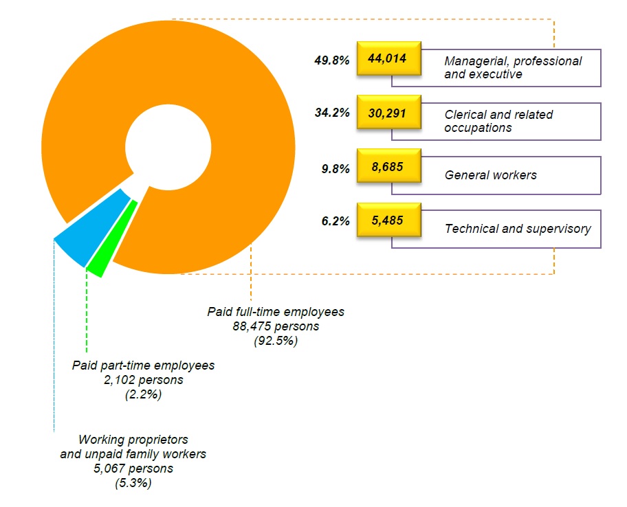 Managerial, professional and executive category of paid full-time employees constituted the highest number with 44,014 persons (49.8%) followed by clerical and related occupations (34.2%), general workers (9.8%) and technical and supervisory (6.2%). The distribution of the total number of persons engaged by category of workers for the year 2014 is shown in Chart 2.