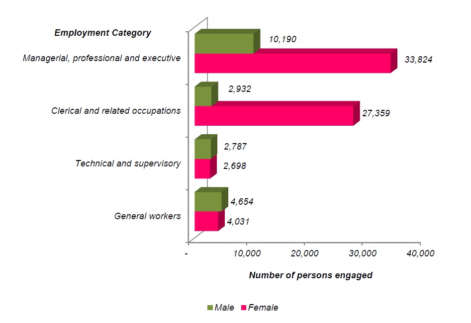 In terms of number of persons engaged by sex, female workers dominated this sub-sector with 70,827 persons (74.1%) as compared to male workers with 25.9 per cent. It was observed that female workers outnumbered male workers for paid full-time and paid part-time employees. For paid full-time employees, the number of female workers was higher than male workers in managerial, professional and executive (female: 33,824 persons; male: 10,190 persons) as well as clerical and related occupations (female: 27,359 persons; male: 2,932 persons) as illustrated in Chart 3.