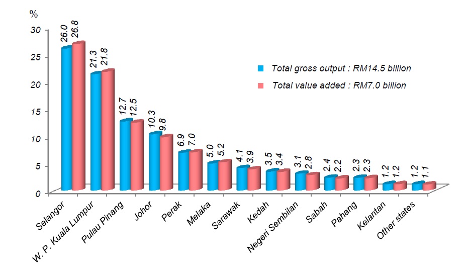 Selangor dominated the private health services in both gross output and value added of RM3.8 billion (26.0%) and RM1.9 billion (26.8%) respectively. This was followed by W.P. Kuala Lumpur which recorded gross output of RM3.1 billion (21.3%) and value added of RM1.5 billion (21.8%). Next was Pulau Pinang which registered RM1.8 billion and RM0.9 billion of gross output and value added respectively. These three states cumulatively contributed 60.0 per cent to the gross output and 61.1 per cent to total value added of health services (Chart 6).