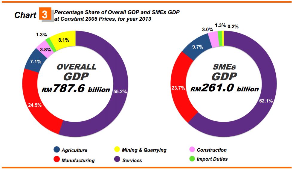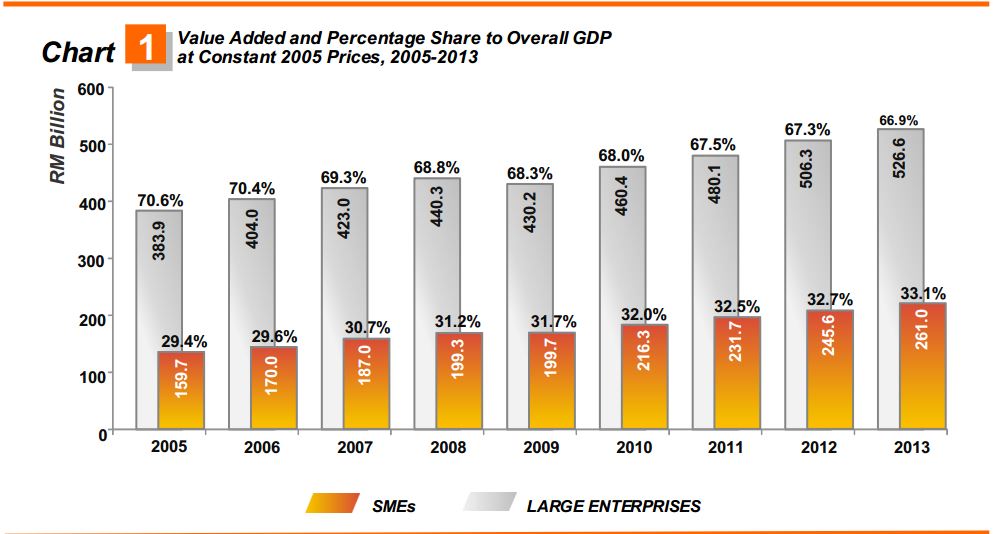 The contribution of SMEs GDP to Malaysia’s economy expanded to 33.1 per cent (Chart 1), an increase of 0.5 per cent from year 2012. Value added of SMEs at constant 2005 prices was RM261.0 billion in 2013 as compared to RM245.6 billion in the preceding year. In current prices, SMEs registered a value added of